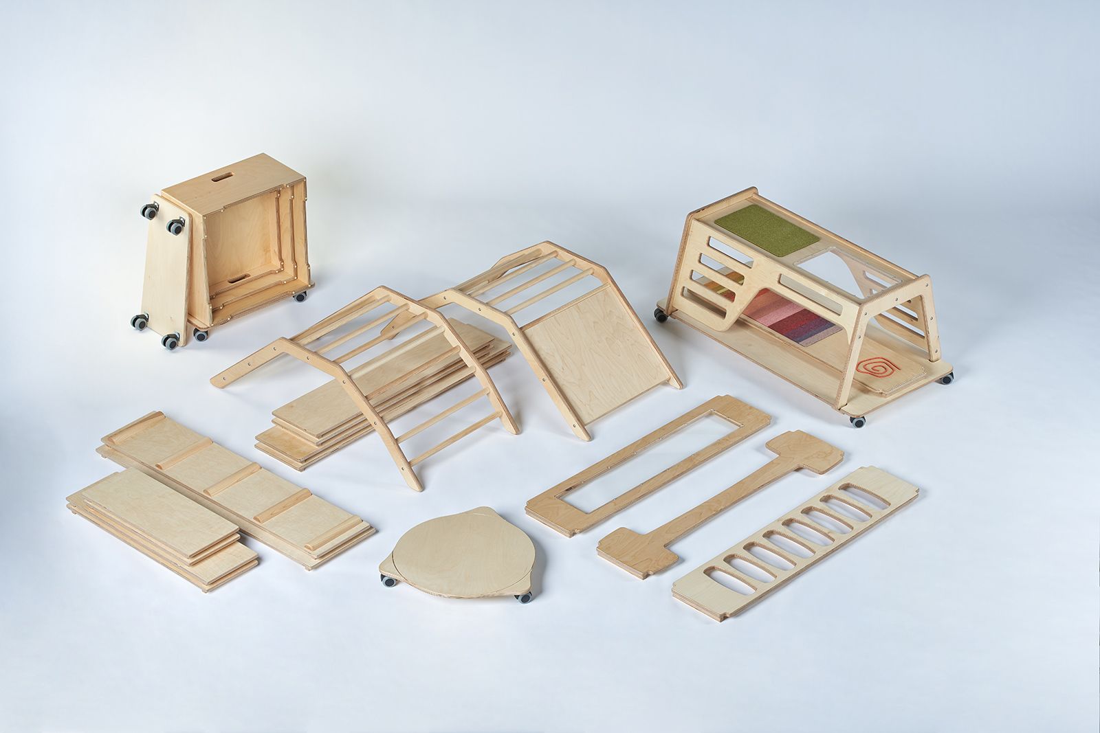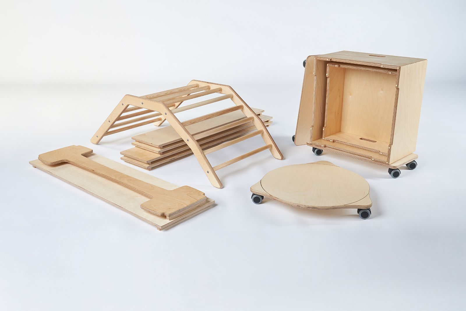 Sie besteht aus Sprossenleiter (Kletterdreieck & Kletterbogen), Sprossentunnel, Balancierbretter, Rollbretter, Plattformen und Sinnespfade. Mit ergänzenden Bausteinen, Decken und anderen kostengünstigen Materialien, entstehen nach dem Prinzip der Selbsttätigkeit facettenreiche Bewegungslandschaften, Rückzugsorte und Gelegenheiten, um physikalische und mathematische Prinzipien zu erkunden.
