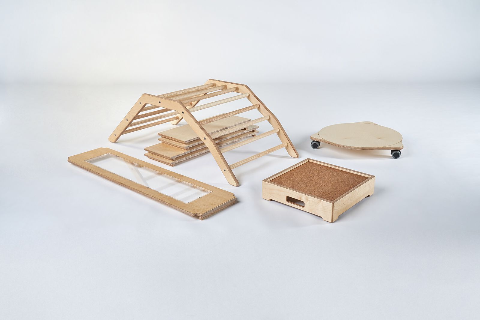 Sie besteht aus Sprossenleiter (Kletterdreieck & Kletterbogen), Sprossentunnel, Balancierbretter, Rollbretter, Plattformen und Sinnespfade. Mit ergänzenden Bausteinen, Decken und anderen kostengünstigen Materialien, entstehen nach dem Prinzip der Selbsttätigkeit facettenreiche Bewegungslandschaften, Rückzugsorte und Gelegenheiten, um physikalische und mathematische Prinzipien zu erkunden.